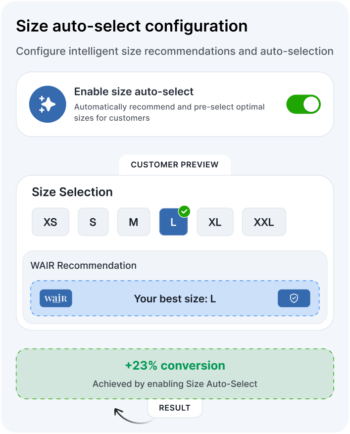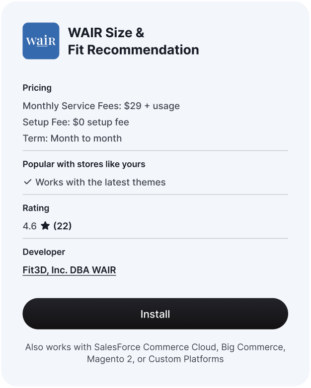 Your shoppers don’t know what size to buy, which leads to abandoned sessions, high return rates, and bracketing. Adding WAIR gives your customers size selection confidence, which increases your profitability.
